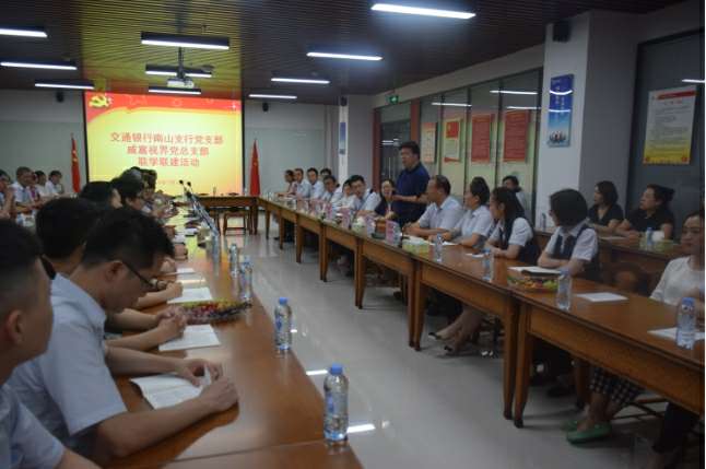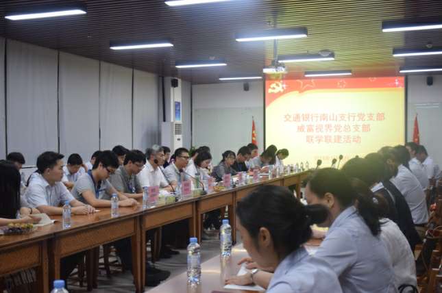 2018年7月18日晚,交通银行南山支行党支部与深圳市金年汇官方版网站登录入口-金年汇(中国)有限公司党总支部在金年汇官方版网站登录入口-金年汇(中国)集团总部开展了联学联建活动。交通银行南山支行党支部书记张伟胜、副书记高静、纪检委员沈向东、宣传委员郭孟瑶、青年委员杜哲、女工委员彭澎、深圳市金年汇官方版网站登录入口-金年汇(中国)有限公司党总支部书记张少林、纪检委员兼深圳市金年汇官方版网站登录入口-金年汇(中国)有限公司党支部书记梁先扬、组织委员兼深圳市金年汇官方版网站登录入口-金年汇(中国)智能设备有限公司党支部书记关航健、生活委员兼金年汇官方版网站登录入口-金年汇(中国)党支部书记肖波、党办主任杨燕丽、金年汇官方版网站登录入口-金年汇(中国)党支部组织委员乔亚飞及各支部党员60余人参加了活动,活动由金年汇官方版网站登录入口-金年汇(中国)党总支部书记张少林主持。